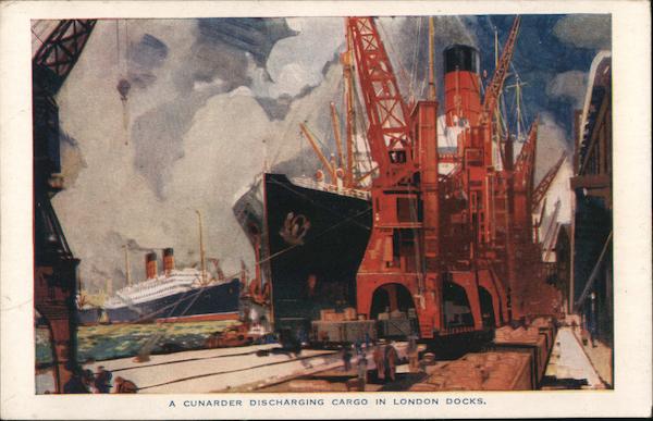 Front: 30% A CUNARDER DISCHARGING CARGO IN LONDON DOCKS. Back: 18 CORRESPONDENCE. ENGLAND LINE AGENCY W. W. JONES, DOOLY & CO., LTD., 28 BRUNSWICK ST., LIVERPOOL. CUNARD