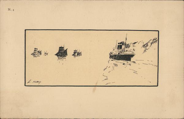 Drawing of Steamship and Sailboats