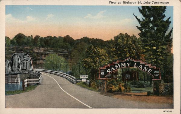 Front: View on Highway 80, Lake Taneycomo SAMMY LANE CABINS FRESH COOK WITH WATER GAS POOL UME TANEY O CAFEI 7A700-N Back: WHITE RIVER ART STATION, GRACE BISHOP, BRANSON, MO.