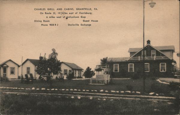 Front: CHARLES GRILL AND CABINS, GRANTVILLE, PA. On Route 22, 14 miles east of Harrisburg; 6 miles west of Indiantown Gap Dining Room Guest House Phone 9028 R 2 Shellsville Exchange ces 日日ヨ目 Back: HARRISBURG WALMER
