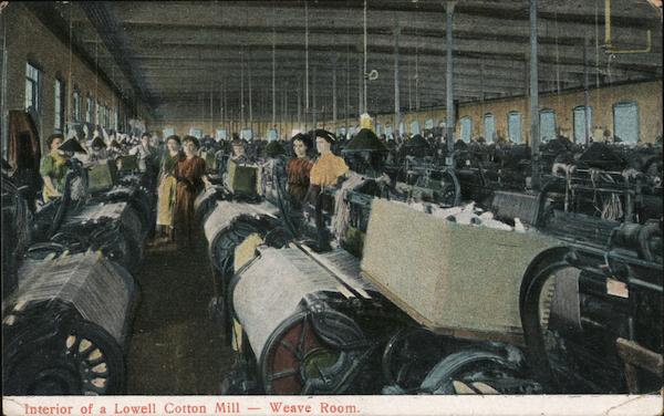Front: Interior of a Lowell Cotton Mill Weave Room. Back: Made in Germany. Reichwer Bros., Publishers, Boston, München, Leipzig. This Space below for Writing. 9,25 Place the Stamp