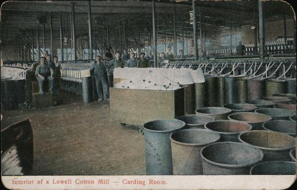 Front: Interior of a Lowell Cotton Mill Carding Room. Back: Made in Germany. Reichner Bros., Publishers, Boston, München, Leipzig. This Space below for Writing. Place the Stamp