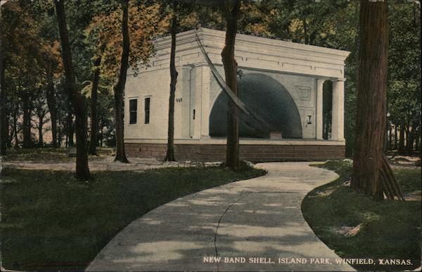 Front: %3D NEW BAND SHELL, ISLAND PARK, WINFIELD, XANSAS. Back: NFIA WIL JUL+4 -POST 은 ů kis T. PHOTOCHROM oue laula bark Miss Corda Bertch of the best in the stante, @mposia Ite a are su it Kansas She resthing, but keeps us norinte att 21 Cong.