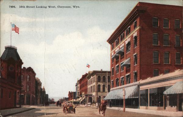 Front: 7494. 16th Street Looking West, Cheyenne, Wyo. Back: NE POST ARD AUG 2 67 CNN Hello - Every body Mrs Wm Haged got in last night 490 Swisunt Kramerfamily Elgin 2.00