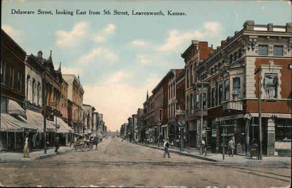 Front: Delaware Street, looking East from 5th Street, Leavenworth, Kansas. DROBS CXTISTS A ICAN BENTAL PARIC8S EH SCHO iL1SCHOTT MERL & CLOTHING Back: / 15 do Your us ola daged yestraay nar A-5689