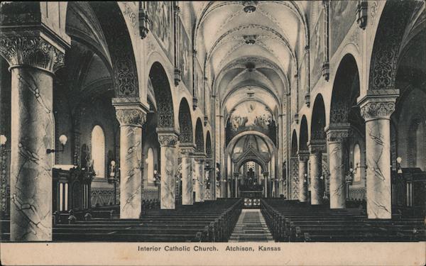 Front: AWA Interior Catholic Church. Atchison, Kansas Back: EL OST CARD United States, and Island Possessions, Cuba, Canada and N. v. LEIPZIG DRESDEN BERLIN For all other Countries No. B 689 Published by J. H. Brown & Son, Atchison, Kans. 2-