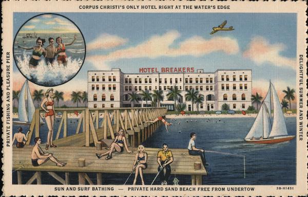 | Corpus Christi's Only Hotel Right At The Water's Edge Private Fishing and Pleasure Pier Sun and Surf Bathing - Private Hard Sand Beach Free From Undertow Delightful Summer and Winter "Overlooking Beautiful Corpus Christi Bay" Private Tub and Shower Baths Recreation Hall - Coffee Shop - Bathers Lounge Surf Bathing from Your Room Free Parking Grounds |