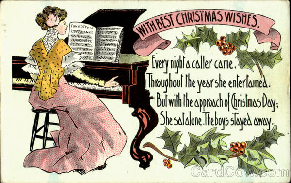 Every night a caller came, throughout the year she entertained. But with the approach of Christmas day; she sat alone. The boys stayed away.