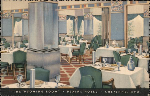 Front: 72 "THE WYOMING ROOM" PLAINS HOTEL •CHEYENNE, WYO. Back: 7A-H2 29 THE PLAINS HOTEL CHEYENNE, WYOMING "Wyoming's Largest and Foremost Hotel" Air Conditioned "C.T. PHOTO-COLORIT”REG.U.S. PAT. OFF. MADE ONLYBYCURT TEICH & CO., INC., CHICAGO