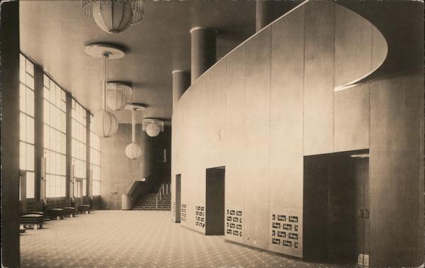 The Grand Foyer of the Center Theatre. the soft color and texture of the Bubinga Mahogany walls is accentuated by the brilliant vermillion of the auditorium entrance doors below, and the column heads of the mezzanine promenade above. Photograph by Samuel Gottscho. |