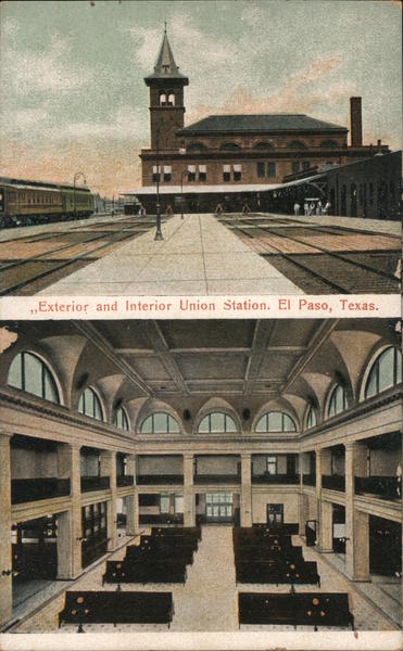 Front: Exterior and Interior Union Station. El Paso, Texas. Back: 16 10 TARJETA POSTAL. POST-CARD. (This space may be used for correspondence. Lado que se reserva para la correspondencia Para la dirección solamente