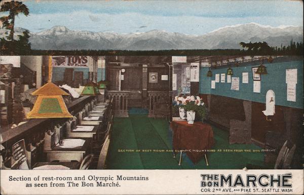 SECTION OF REST ROOM AND OLYMPIC MOUNTAINS AS SEEN FROM THE BON MARCHE