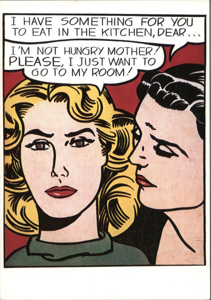 Front: I HAVE SOMETHING FOR YOU TO EAT IN THE KITCHEN, DEAR... I'M NOT HUNGRY MOTHER? PLEASE, I JUST WANT TO GO TO MY ROOM! Back: LICHTENSTEIN Eddie Diptych - 1962 Éditions Hazan, Paris © SPADEM 1362