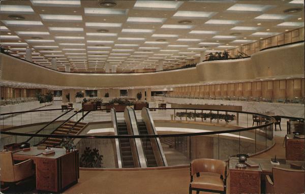 | A view from the banking floor. A city block in length and covering almost an acre in space, this is considered to be the largest unobstructed bank area ever built. Its rich, colorful décor is accented with maple paneling, marble, glass and gold leaf. |