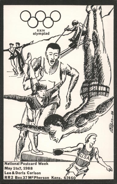 Front: XXIV olympiad National Postcard Week May 1to7, 1988 Lee & Doris Carlson RR2 Box 37 MCPherson Kans. 67460 Back: Limited Edition Edition2 31/ 300 Printed by Cherry Street Press, Inc./McPherson, Kansas 67460