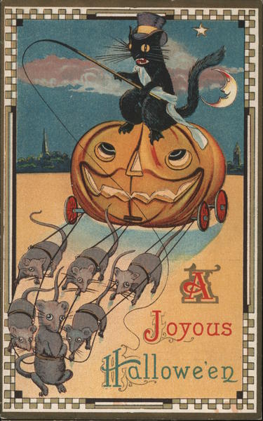 A Joyous Halloween Cat Riding Pumpkin Pulled by Mice