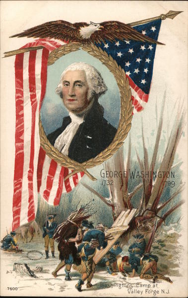 Front: GEORGE WASHINGTON 1732 799 1908 UUS BIEN A CO Washingtons Camp at Mam Valley Forge N.J. 7600 Back: GREAT BRITAIN FOREIGN: THIS SPACE MAY BE USED FOR WRITING WASHINGTON" SERIES NUMBER 760
