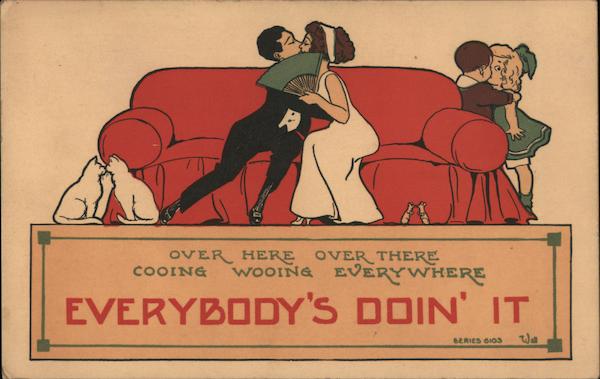 Front: OVER HERE OVER THERE wooING EVERYWHERE COOING EVERYBODY'S DOIN' IT Wan SERIES 610S Back: chewing gurut Bananas. Candy Stamps POT.CARD 06 - .20 os ob anna os