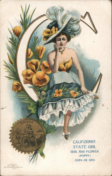 Front: EUREKA CALIFORNIA STATE GIRL SEAL AND PLOWER Hou (POPPY) COPA DE ORO COPYRIENS 906 BY PLATINACMROME Co. N.Y. Back: G. OKLYN MERICA POR PPOBZIA STATION GT 7-30P 07 NYOZ-V 1796 FRANKLINIO Shacten Halter Semmill 367 Bainbridge th Brooklyn rey