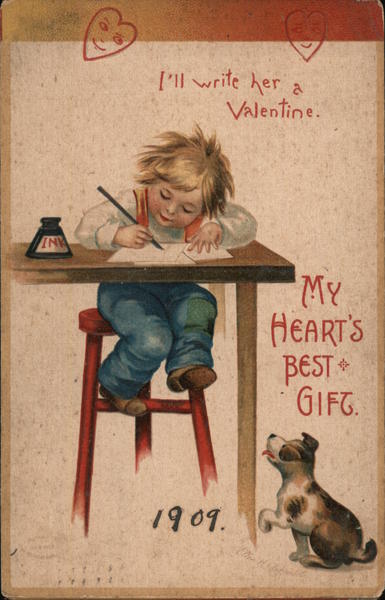 Front: ['ll write her a Valentine. INK MY HEART'S BEST GIFT. 1909. COP R ORTED Back: PUBLISHING CO. INTERNATIONAL ART Series No. 831 LYNN NEW-YORK BERLIN FEB 13 5:5pl 1909 ness Sreo Bjornqin 652.50ch Street, Brooklyn by
