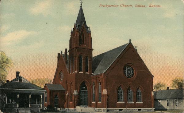 Front: Presbyteriar Church, Salina, Kansas. Back: #2.00 U.S. DOSTAGE 741 HT XX CAR) MESSAGE MAY BE WRITTEN ON THIS SIDE. Baline, it We sure are starting out finem atayed at a hotel the first sight we slure were tired Bube 304 Taylor Topeka Ko