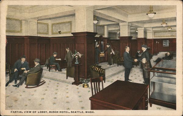Front: ARA PARTIAL VIEW OF LOBBY, BUSCH HOTEL, SEATTLE, WASH. **** Back: 50 R-64105 MADE IN U.S. A. C.T AMERICAN PUBLISHED BY V.0. HOPF, SEATTLE, WASH Vegeu