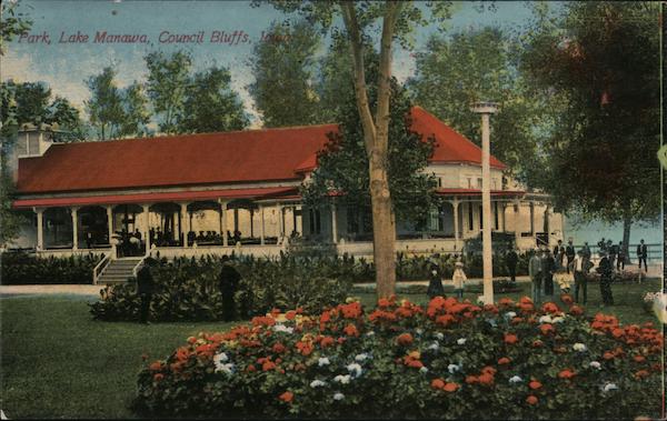 Front: Park, Lake Manawa, Council Bluffs, Back: AND CANADA, ONE CEAT. FOREIGN. Two CENTS. iron Pub. by. Megeath Stat’y Co., Omaha, Neb. Papa Pellülace, Baku Vudique Thebe 2716