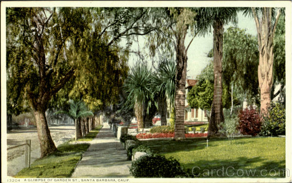 Front: 13204 A GLIMPSE OF GARDEN ST., SANTA BARBARA, CALIF. Back: "PHOSTINT" CARD. TRADE MARK REG. U. S. PAT. OFF. MADE ONLY BY DETROIT PUBLISHING CO. AND CANADA. FOREIGN. TWO THIS SPACE MAY BE USED FOR MESSAGE. THIS SPACE FOR THE ADDRESS.
