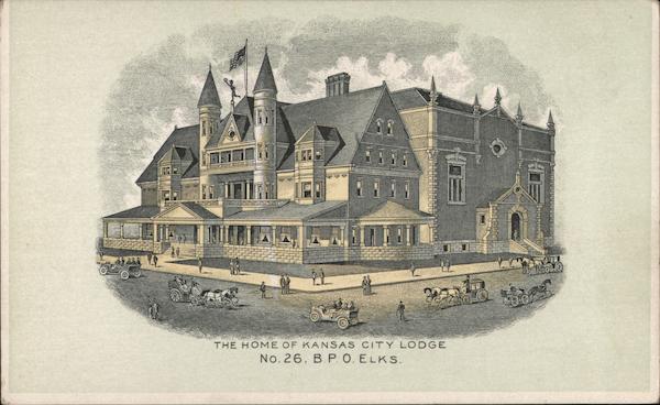 Front: Hild THE HOME OF KANSAS CITY LODGE No.26, B.P. O. ELKS. Back: # 2.50 U. S. AND FOREIGN, TWO CENTS. ucu LITHO BY B. & M. LITHO Co., К. С. Мо