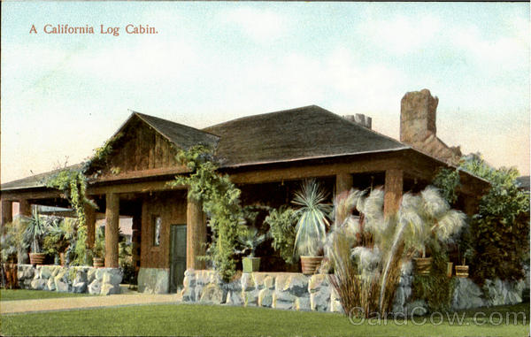 Front: A California Log Cabin. Back: IN SPACE BELOW MAY BE WRITTEN SENDER'S NAME AND M. Rieder, Publ., Los Angeles, Cal. and Leipzig. No. 3077. 1 c THE SPACE ABOVE IS RESERVED FOR POSTMARK. Mexican 2 c