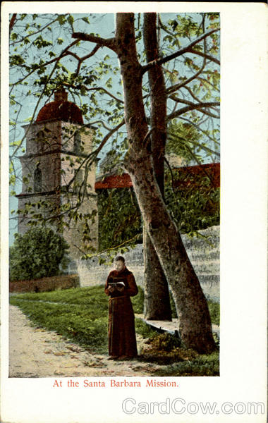 Front: At the Santa Barbara Mission. Back: M. Rieder, Publ., Los Angeles, Cal. No. 3521. MADE IN GERMANY.