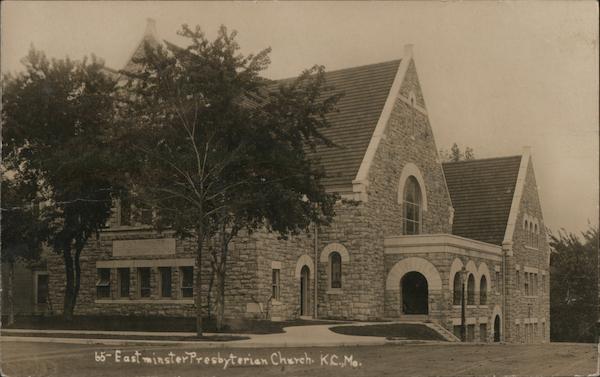 Front: EASTMINSTER PRESBYTERIAN CHURCH b5- East minsterPresbyterian Cherch. KC,Mo. Back: А 2 O 2 STAMP 0 N A 20A KANSAS CITY, U. S. A. PUBLISHED BY