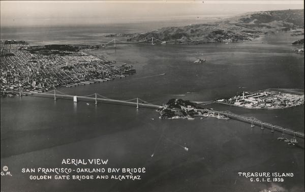 AERIAL VIEW SAN FRANCISCO-OAKLAND BAY BRIDGE GOLDEN GATE BRIDGE AND ALCATRAZ G.M. TREASURE ISLAND G.G.I. E. 1939