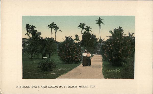 Front: 206,594 V HIBISCUS (DATE AND COCOA NUT PALMS), MIAMI. FLA. Back: The Valentine & Sons' Pu slishing Co., Ltd., New York SOUVENIR POST GARD 8-