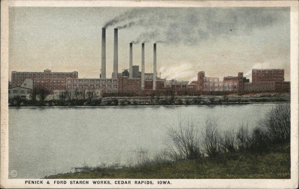 Front: PENICK & FORD STARCH WORKS, CEDAR RAPIDS, 1OWA. Back: 88 lham L+* 3 CARD Come e co con 58194--PUB. BY WILLIAM BAYLIS, LANDSCAPE PHOTOGRAPHER, CEDAR RAPIDS, IOWA