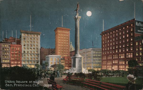 Front: Matha CH HOUSI Union Square at night San Francisco, Cal 069 Back: Sic 2ยข es PUD BY SOUVENIR PUBLISHING CO. SAN FRANCISCO