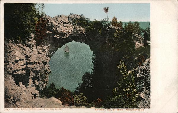Front: 5147. ARCH ROCK, MACKINAC ISLAND, MICH. COPYRIGHT, 1899, BY DETROIT PHOTOGRAPHIC CO. Back: AND CANADA, FOREIGN, Two CENTS.