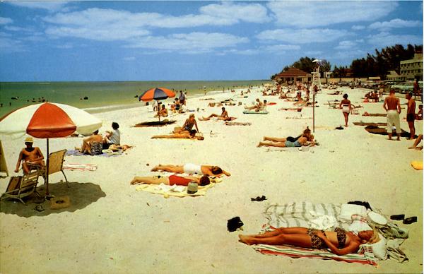 Florida's famous Rockaway Beach at Clear- water. This picture looks northward toward Palm Pavilion from Rockaway Pavilion. (Colorphoto by Ward Beckett) C-17060-C-24 Color Cara o WARD BECKETT & CO CLEARWATER FLA HERE