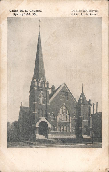 Front: Grace M. E. Church, Springfield, Mo. Duncan & Greaves, 310 St. Louis Street. Back: POSTAL Conforms to the Requirements of Section 418 Postal Laws and Regulations.