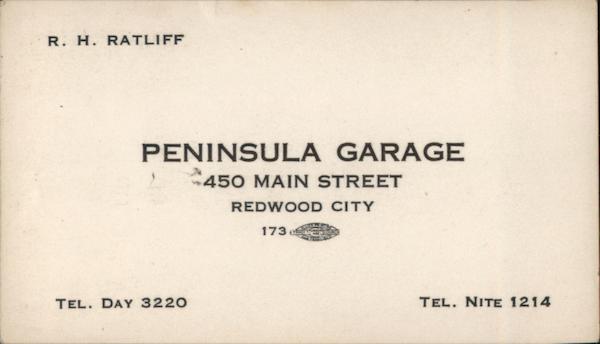 R. H. RATLIFF PENINSULA GARAGE 450 MAIN STREET REDWOOD CITY 173 EADE ALLICO COUNCH ERAN TEL. DAY 3220 TEL. NITE 1214
