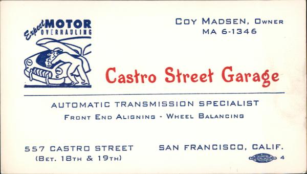 COY MADSEN, OWNER MA 6-1346 ExpelMOTOR VERHAULING Castro Street Garage AUTOMATIC TRANSMISSION SPECIALIST FRONT END ALIGNING • WHEEL BALANCING 557 CASTRO ST REET (BEt. 18TH & 19TH) SAN FRANCISCO, CALIF.