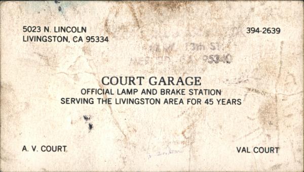 Front: 5023 N. LINCOLN 394-2639 LIVINGSTON, CA 95334 3th St 95340 COURT GARAGE OFFICIAL LAMP AND BRAKE STATION SERVING THE LIVINGSTON AREA FOR 45 YEARS A. V. COURT, VAL COURT Back: 74-350 #8778 237 생 시 WED