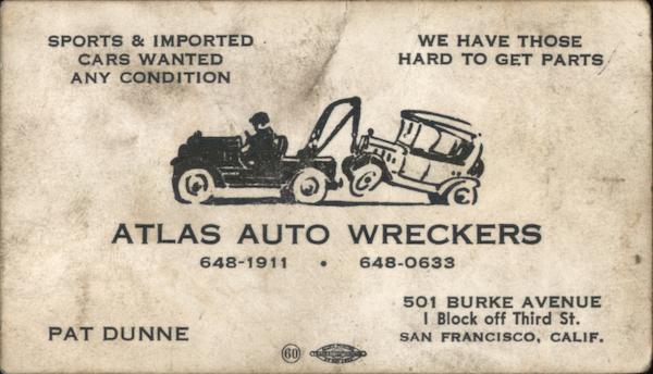 Front: SPORTS 8 IMPORTED CARS WANTED WE HAVE THOSE HARD TO GET PARTS ANY CONDITION ATLAS AUTO WRECKERS 648-1911 648-0633 501 BURKE AVENUE I Block off Third St. SAN FRANCISCO, CALIF. PAT DUNNE 60 Back: 2095 19th are Richtiene 87500