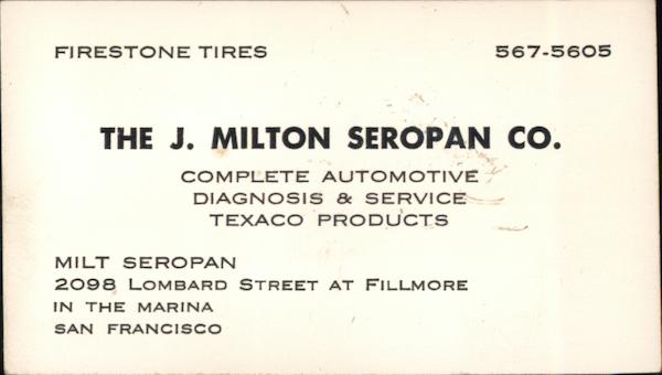 FIRESTONE TIRES 567-5605 THE J. MILTON SEROPAN CO. COMPLETE AUTOMOTIVE DIAGNOSIS & SERVICE TEXACO PRODUCTS MILT SEROPAN 2098 LOMBARD STREET AT FILLMORE IN THE MARINA SAN FR ANCISCO