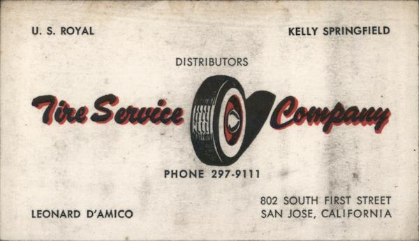 U. S. ROYAL KELLY SPRINGFIELD DISTRIBUTORS Tre Service O Company PHONE 297-9111 802 SOUTH FIRST STREET SAN JOSE, CALIFORNIA LEONARD D'AMICO