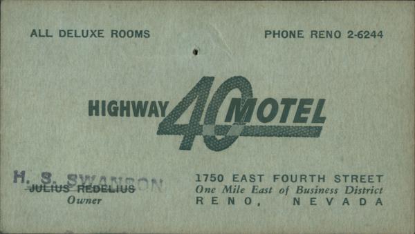 ALL DELUXE ROOMS PHONE RENO 2-6244 400 HIGHWAY H. S. SWAMBON JULIUS REDELIUSN Owner 1750 EAST FOURTH STREET One Mile East of Business District RENO, NEVA DA