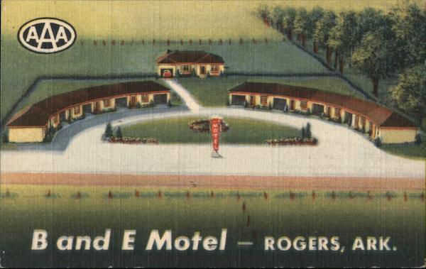 Front: AAA B and E Motel-ROGERS, ARK. Back: B & E FIRE-PROOF PHONE: 18 3 OEш • TILE BATHS • AIR CONDITIONED • PANELRAY HEAT • SIMMONS BEDS WEST OF ROGERS - ON HIGHWAY 71 BOYD & ESSIE LATTA, OWNERS ROGERS, ARKANSAS "The Garden Spot of the Ozarks"
