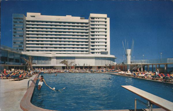 Newest, Largest, and Most Luxurious -550 ft. on the Ocean at 67th Street. 600 incomparable guest rooms and suites - 2 pools - 2 night clubs - 3 dining rooms - ice skating rink - 9-hole short golf course - complete shopping plaza - 100% air-conditioned. |