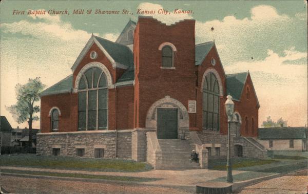Front: First Baptist Church, Mill & Shawnee Sts., Kansas City, Kansas. Back: 2 2 AND CANADA, 514 Published by Jno. W. Kirk. Kansas City, Mo.