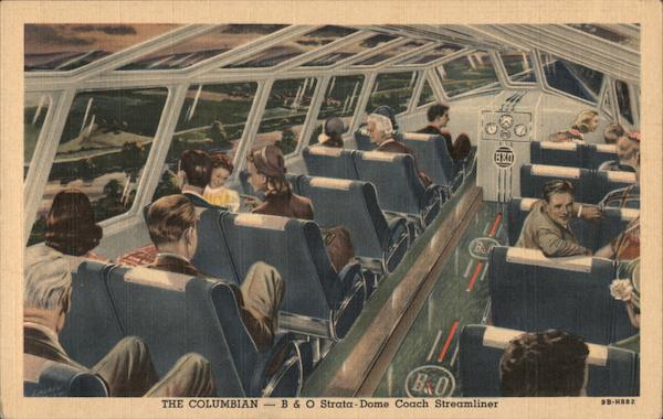 | The Columbian-Diesel-Electric The exciting strata-dome car - a travel dream of yesterday - a thrilling reality today. The only train serving the East with a strata-dome car. Regular coach fares. Stewardess-Nurse. CHICAGO-PITTSBURGH-WASHNGTON |